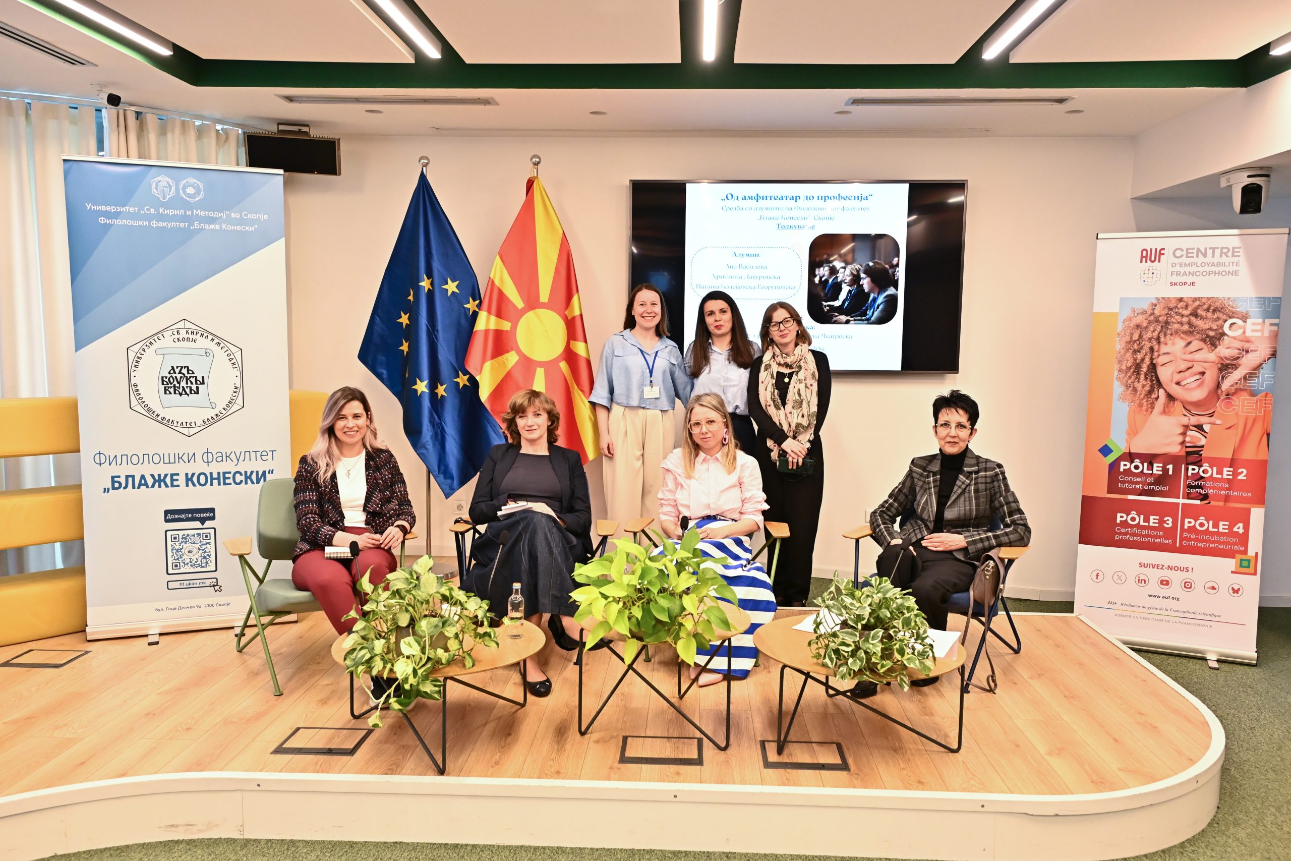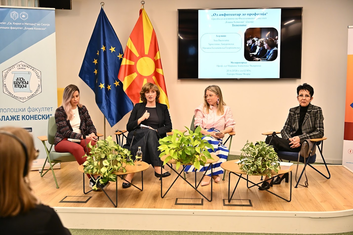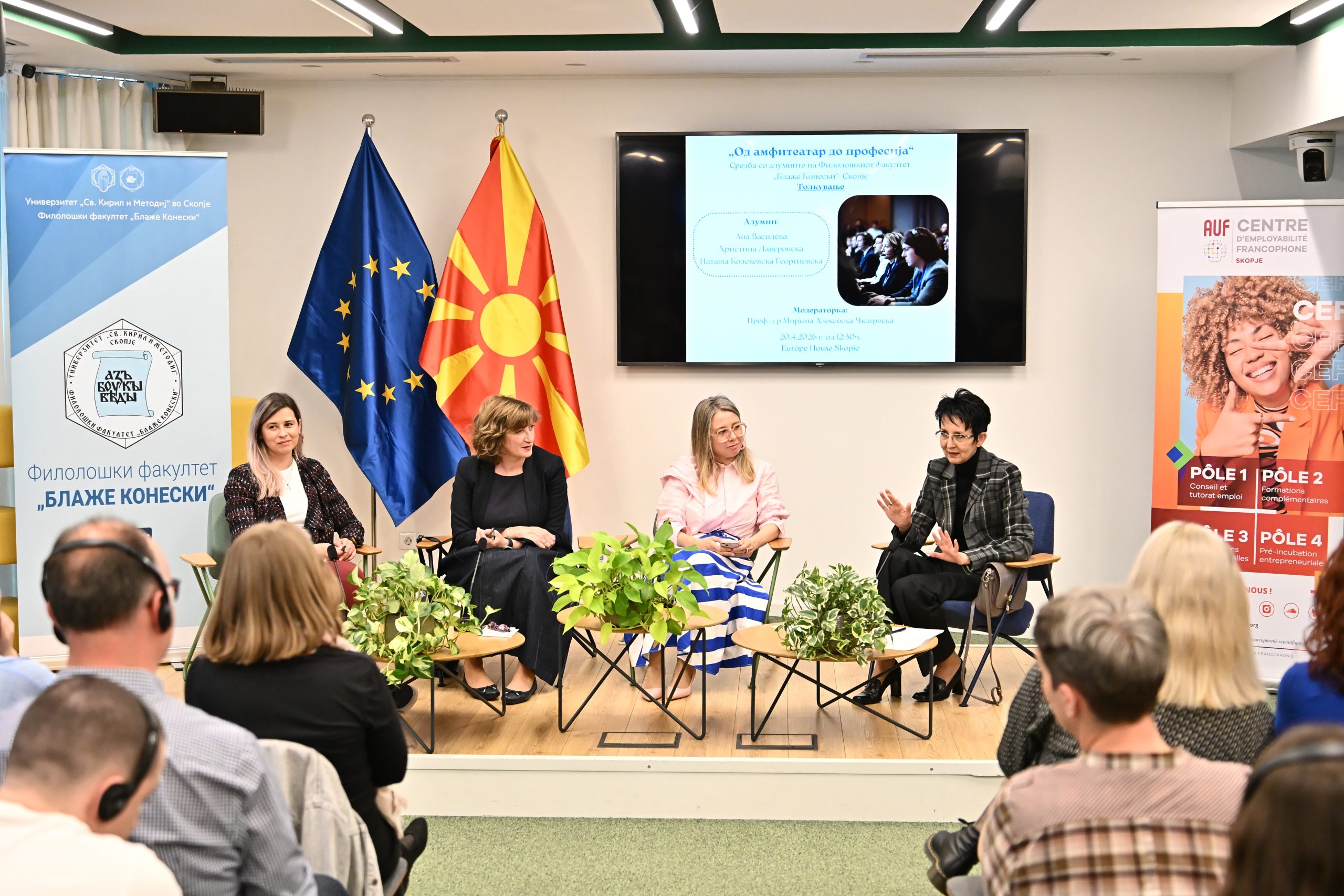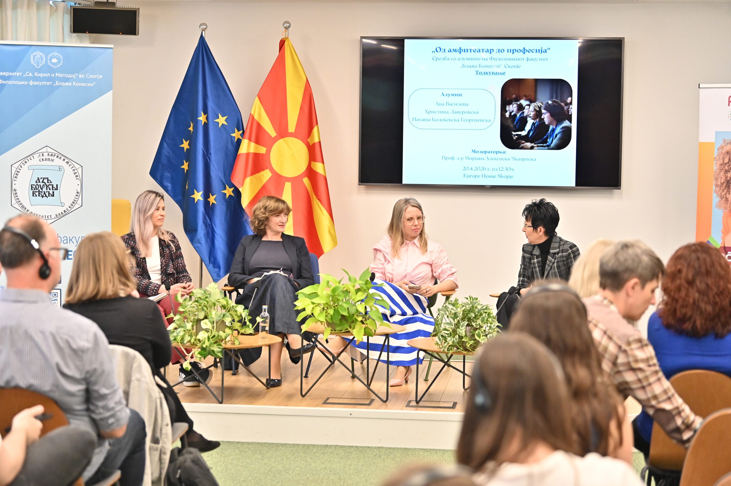 На 20.4.2026 г. во Јуроп Хаус (Europe House) Скопје, се одржа третото издание на средбите со алумни „Од амфитеатар до професија“ во организација на Центарот за кариера и поддршка на алумни при Филолошкиот факултет „Блаже Конески“- Скопје и Франкофонскиот центар за вработливост при УКИМ. Средбата беше посветена на темата „Толкување“. Говорничките Ана Василева, Христина Лавуровска и Наташа Колеќевска-Георгиевска, три толкувачки акредитирани од ЕУ, зборуваа за предизвиците на професијата, споделија искуства и дадоа практични совети. Модераторка на настанот беше проф. д-р Мирјана Алексоска-Чкатроска, која истовремено ги претстави и магистерските студии по Конференциско толкување на Филолошкиот факултет „Блаже Конески“. На настанот се вклучи и Овен Вард, претставник на Директоратот за толкување при Европска комисија и важен соработник на магистерските студии по Конференциско толкување.