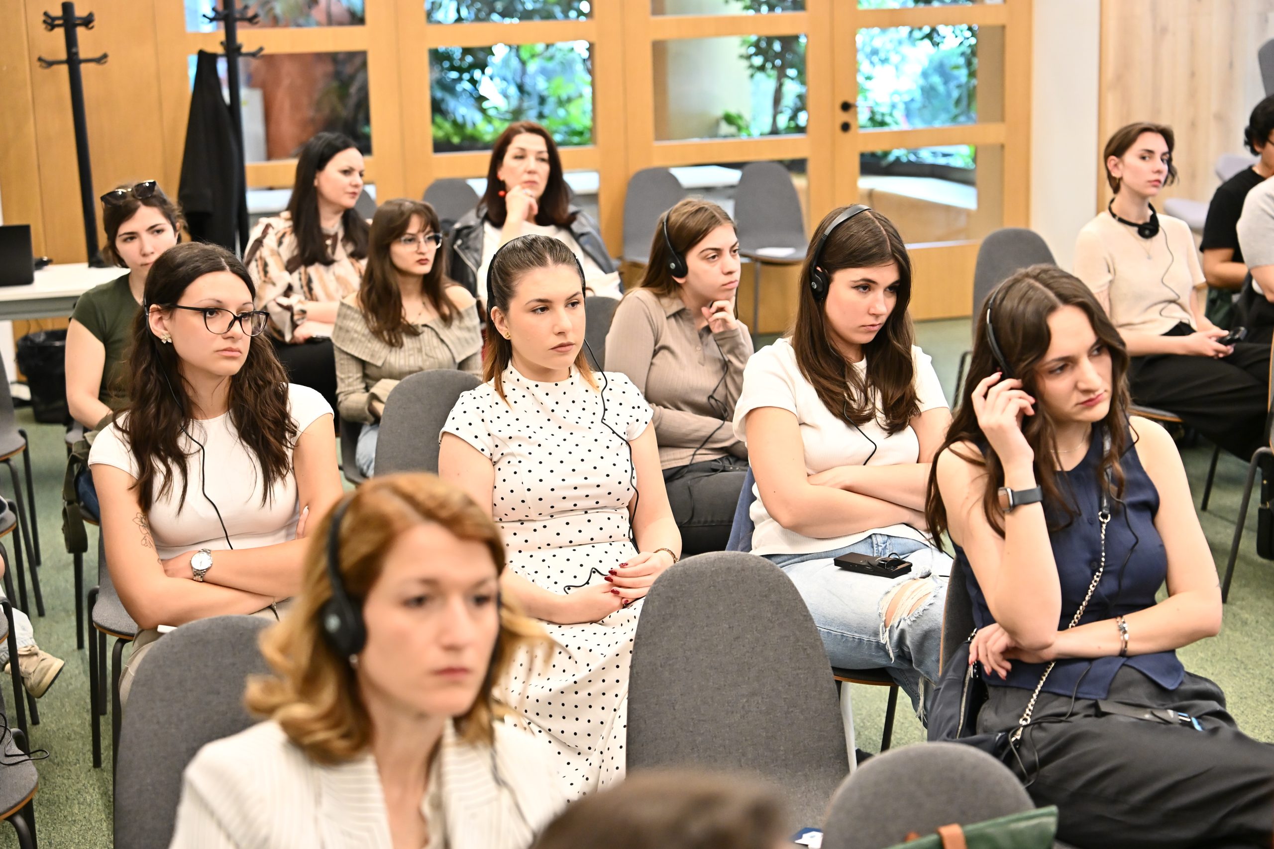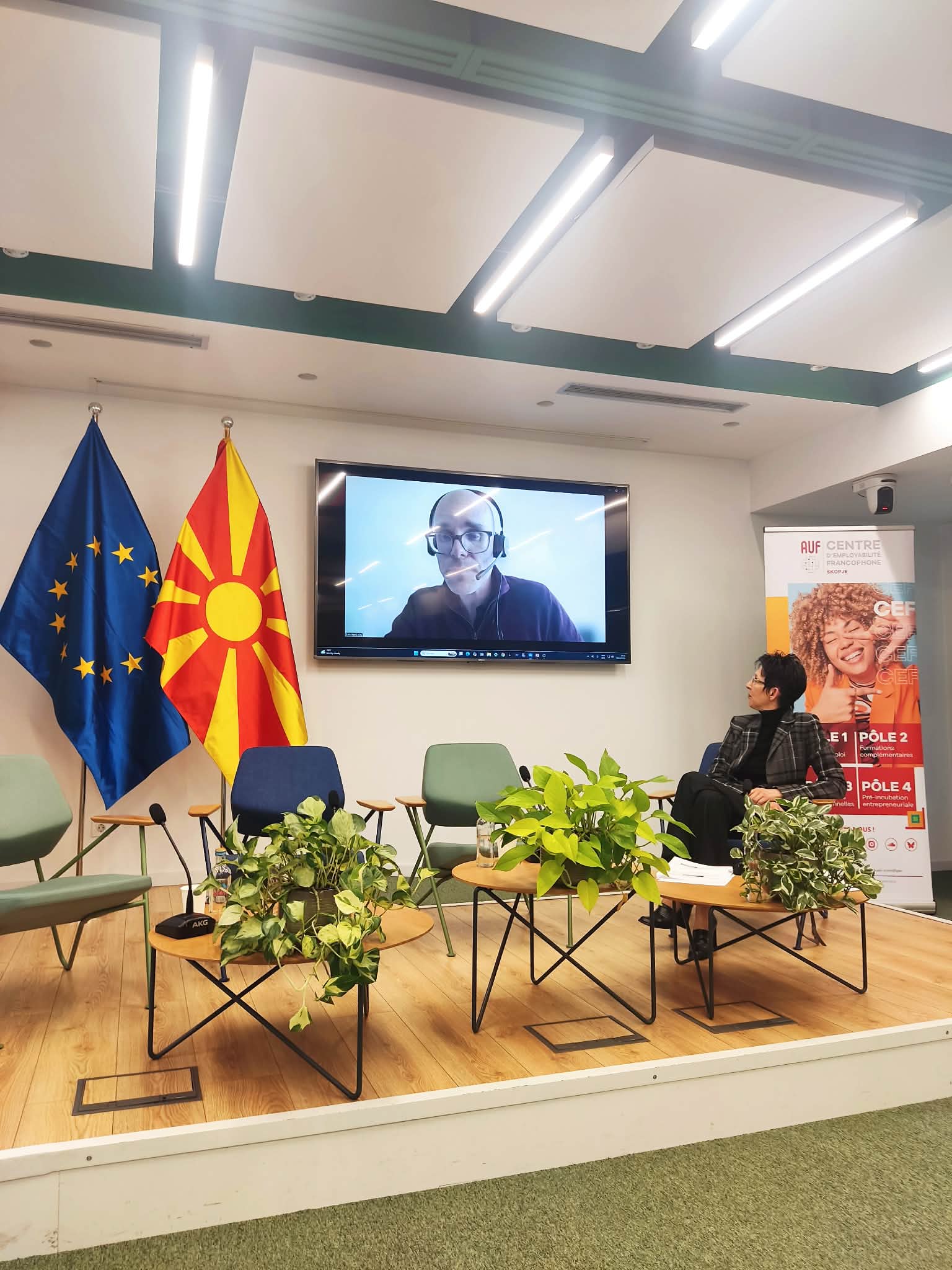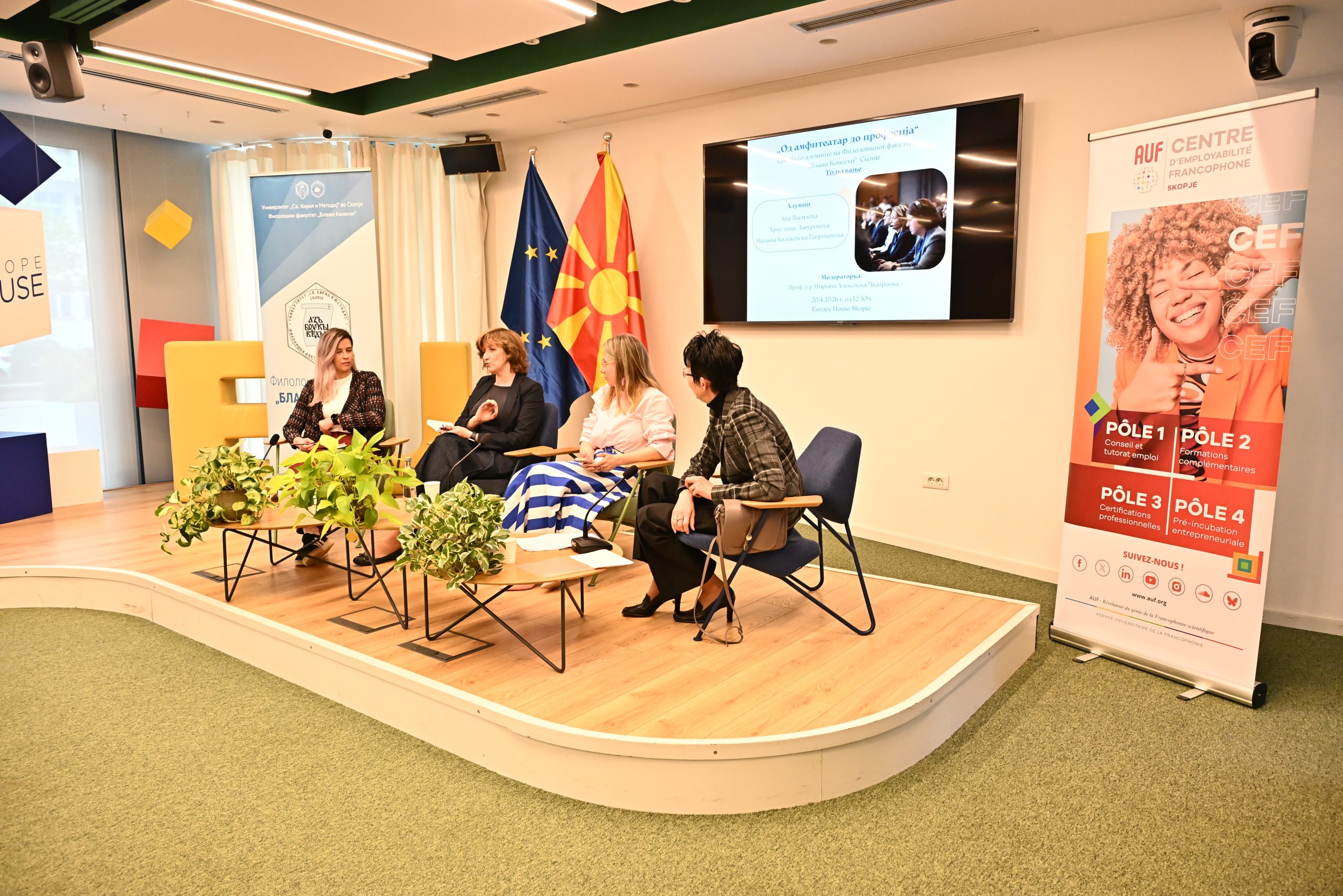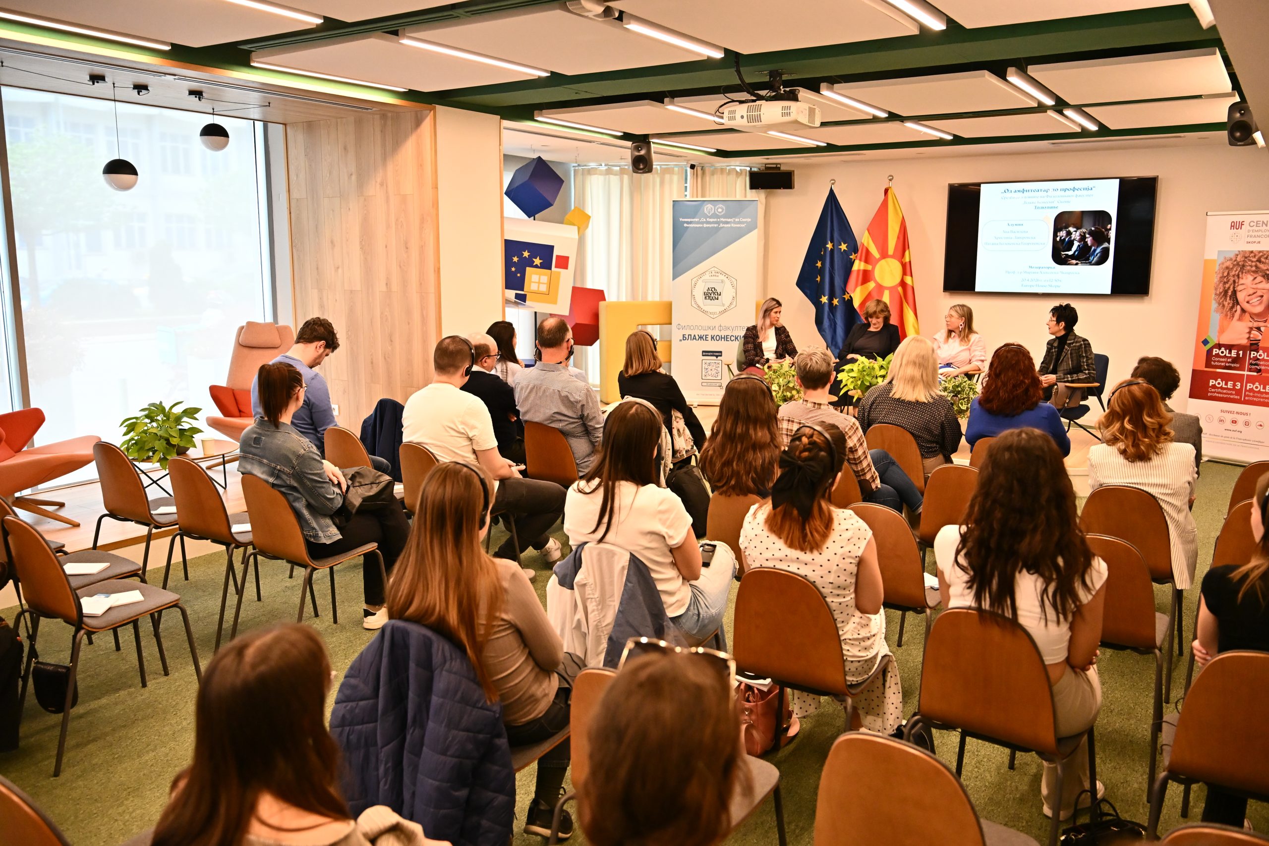 На 20.4.2026 г. во Јуроп Хаус (Europe House) Скопје, се одржа третото издание на средбите со алумни „Од амфитеатар до професија“ во организација на Центарот за кариера и поддршка на алумни при Филолошкиот факултет „Блаже Конески“- Скопје и Франкофонскиот центар за вработливост при УКИМ. Средбата беше посветена на темата „Толкување“. Говорничките Ана Василева, Христина Лавуровска и Наташа Колеќевска-Георгиевска, три толкувачки акредитирани од ЕУ, зборуваа за предизвиците на професијата, споделија искуства и дадоа практични совети. Модераторка на настанот беше проф. д-р Мирјана Алексоска-Чкатроска, која истовремено ги претстави и магистерските студии по Конференциско толкување на Филолошкиот факултет „Блаже Конески“. На настанот се вклучи и Овен Вард, претставник на Директоратот за толкување при Европска комисија и важен соработник на магистерските студии по Конференциско толкување.